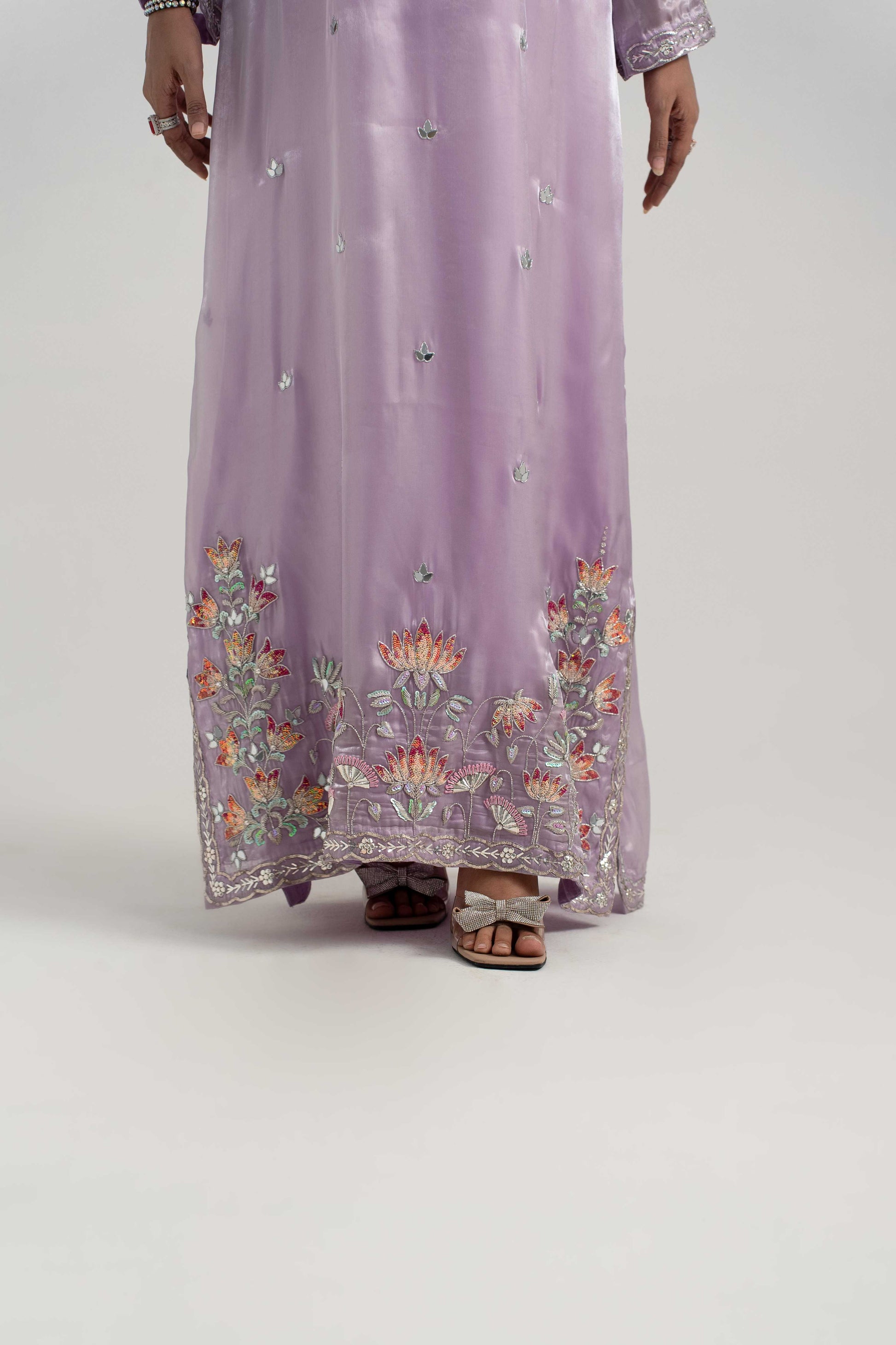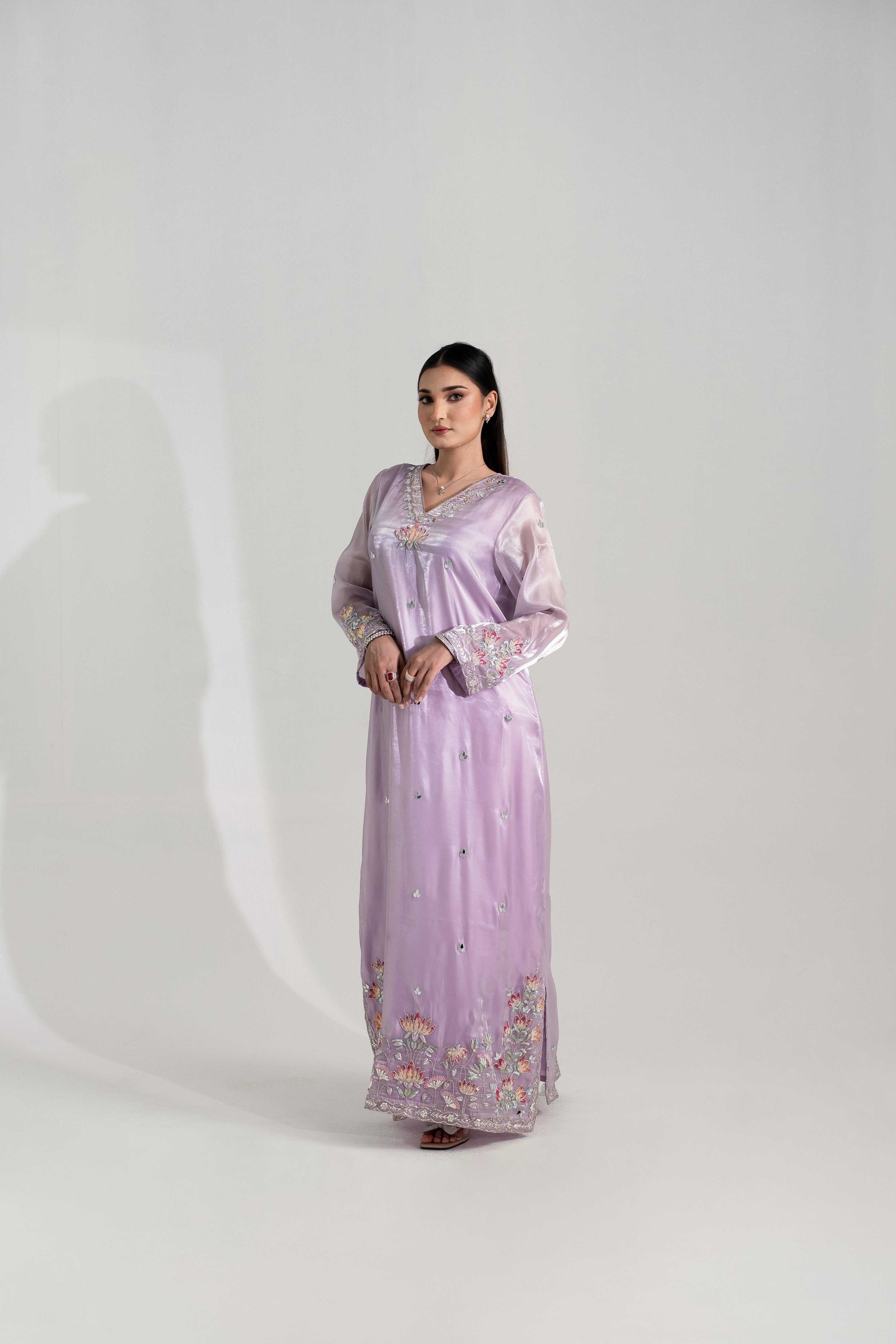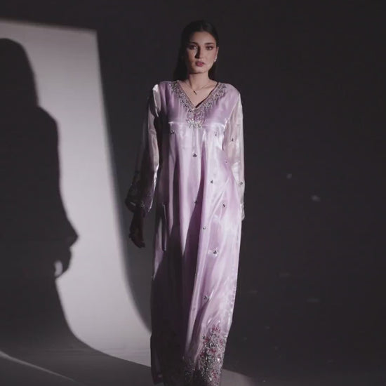 This Sheesha silk kaftan, adorned with mukesh work, sequins, Japani cutdana, and pitta detailing.