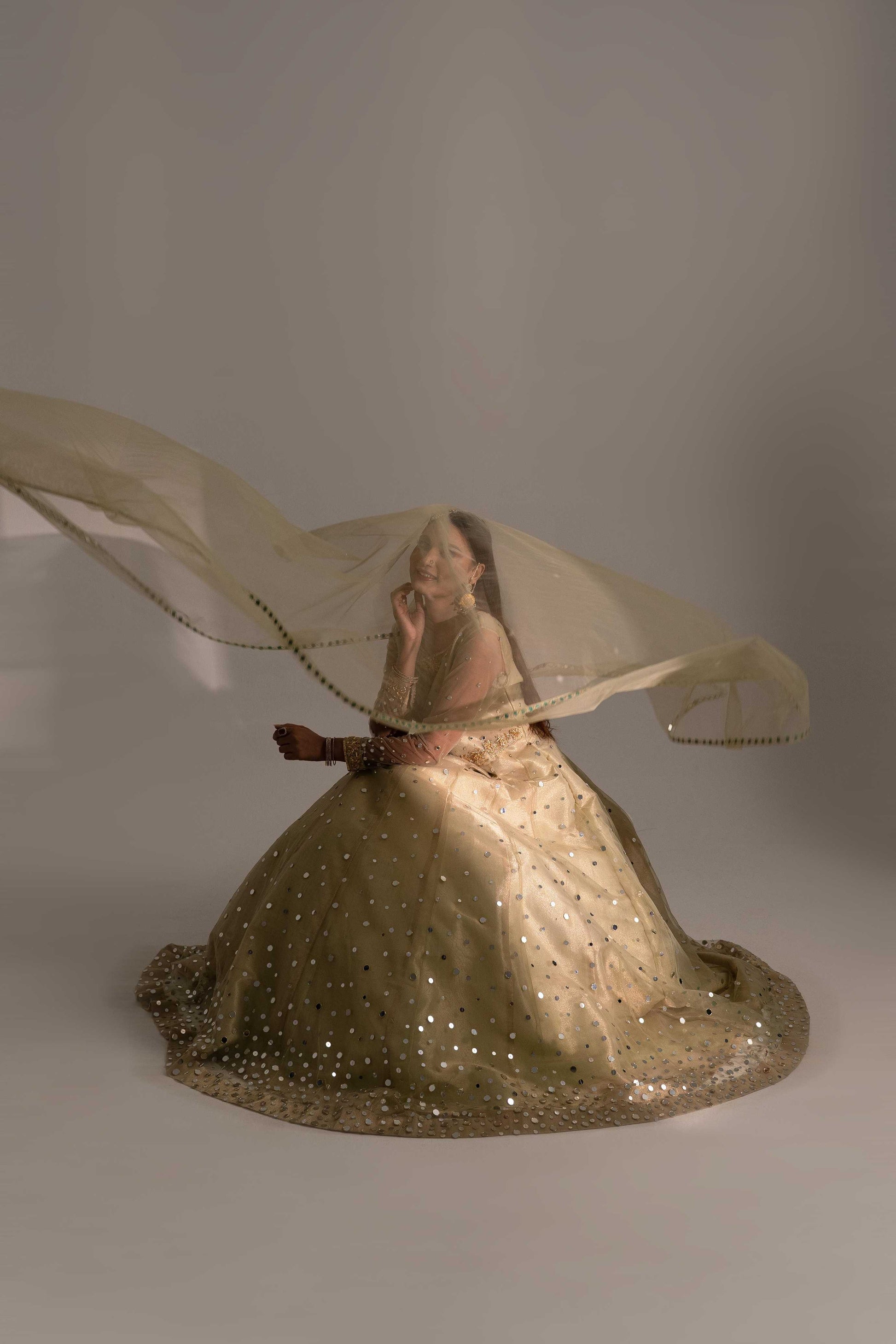 Paired with a net dupatta featuring a sheesha-bordered finish
