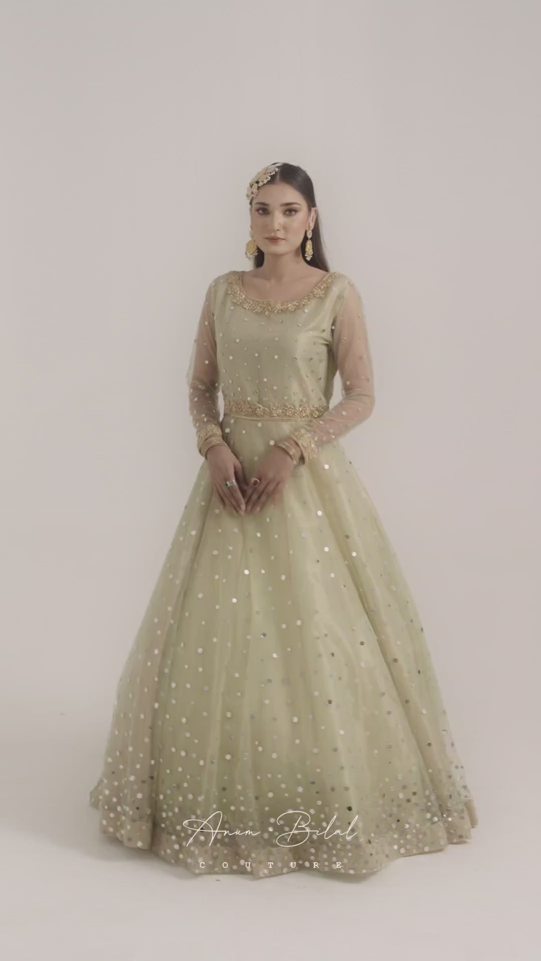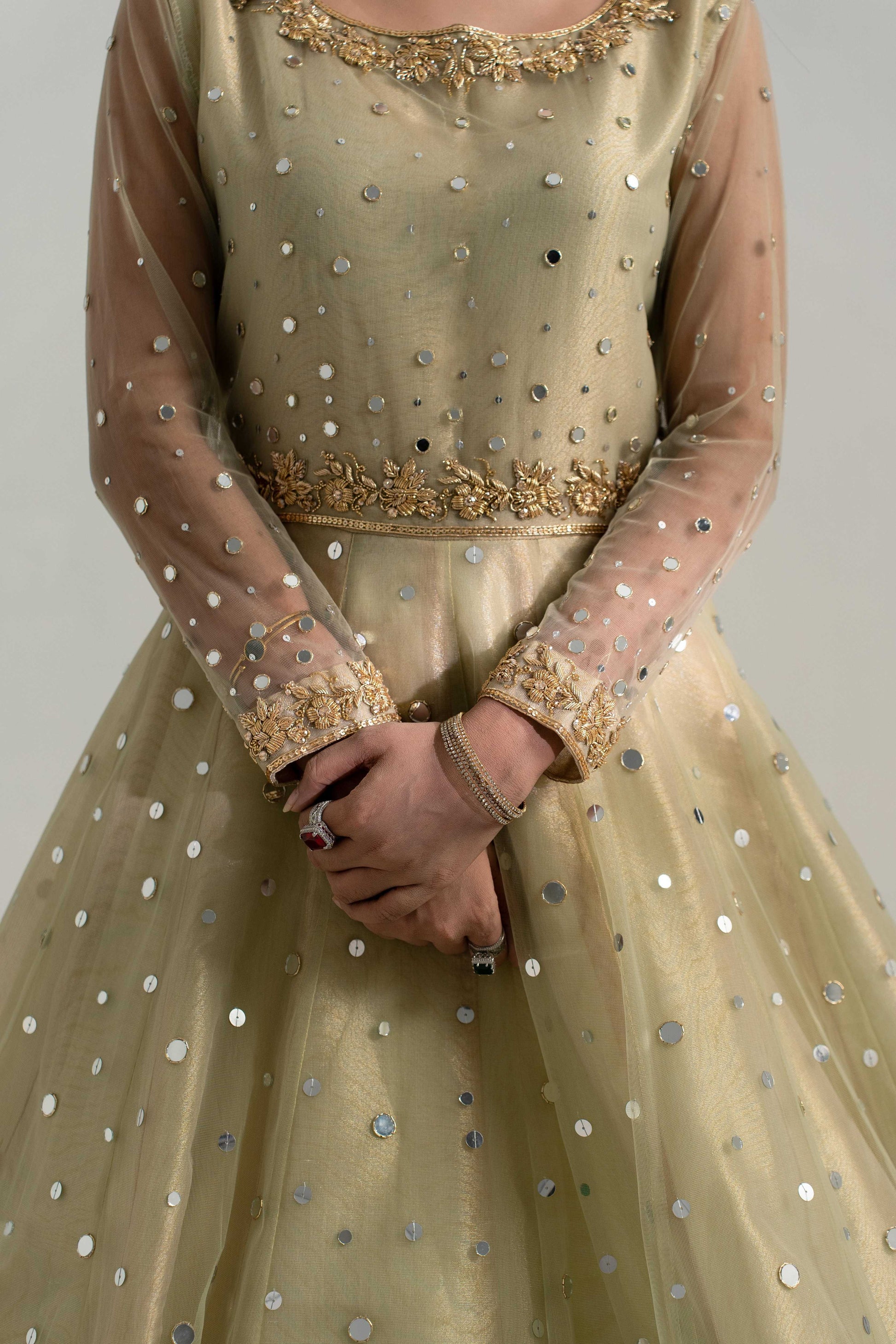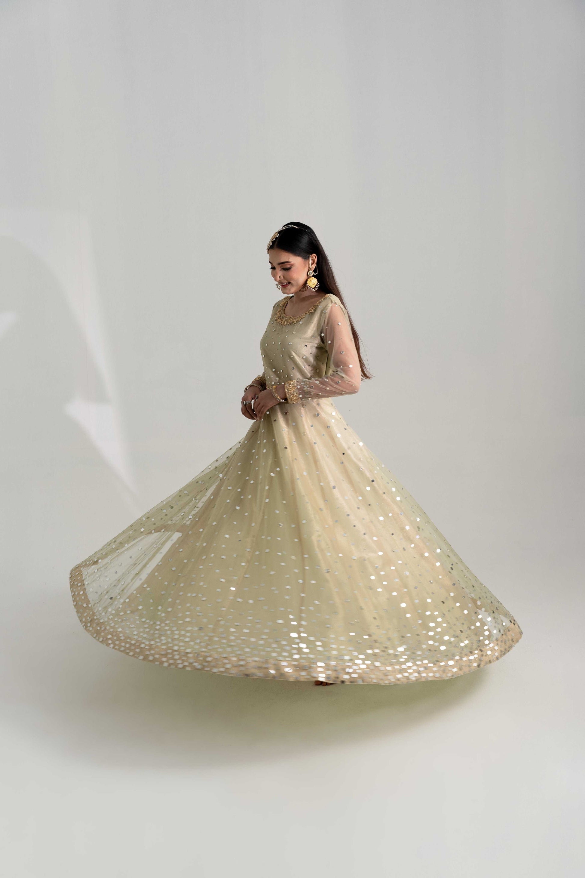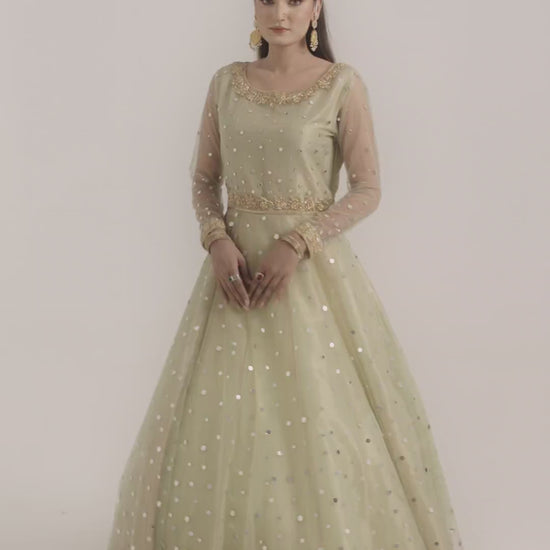 A three-layered frock crafted on a net base with a tissue lining, exquisitely hand-embellished with sequins and sheesha.